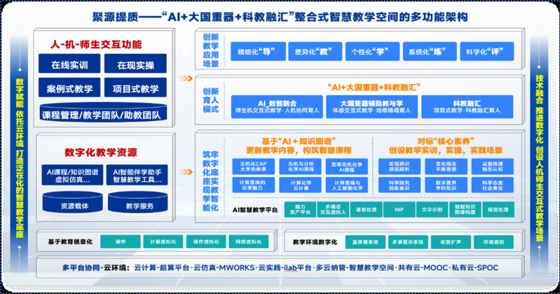 围绕“AI+大国重器+科教融汇”核心,通过数字赋能,依托多平台协同的云环境,打造泛在化的智能教学底座,同时通过技术融合,推进数字化,创设人机师生交互式教学场景,构建逻辑紧密的智能教学应用架构,各模块层层支撑、协同联动。