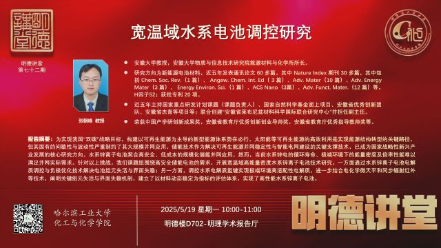 应王博教授邀请,安徽大学物质与信息技术研究院能源材料与化学所所长,安徽大学教授、博导张朝峰教授到我校进行学术访问,并开展060net永利“明德讲堂”学术报告,欢迎广大师生参加。