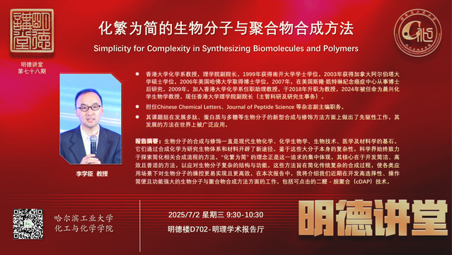 生物分子的合成与修饰一直是现代生物化学、化学生物学、生物技术、医学及材料学的基石。它们通过合成化学为研究生物体系和材料开辟了新途径。鉴于这些大分子本身的复杂性,科学界始终致力于探索简化相关合成流程的方法。“化繁为简” 的理念正是这一追求的集中体现,其核心在于开发简洁、高效且普适的方法,以应对生物分子复杂的结构与功能。这些方法旨在简化传统复杂的合成过程,使各类应用场景下对生物分子的操控更易实现且更高效。在本次报告中,将介绍近期在开发高选择性、操作简便且功能强大的生物分子与聚合物合成方法方面的工作,包括可点击的二醛 - 胺聚合(cDAP)技术。