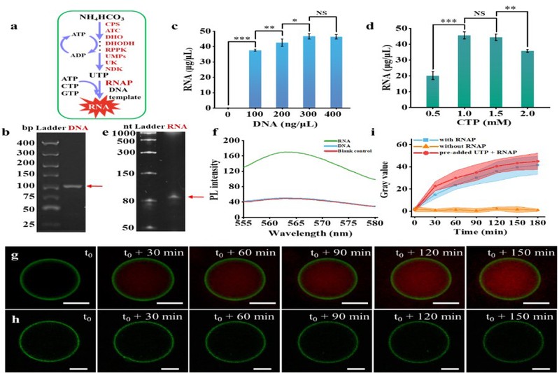 针对上述难题,韩晓军教授团队在人造细胞内实现了核苷酸从头合成代谢通路的构建,并将合成的核苷酸用于RNA转录。该代谢通路以NH4HCO3为起点合成尿苷三磷酸(UTP),包括氨甲酰磷酸合成酶(CPS)、天冬氨酸转氨甲酰基酶(ATC)、二氢乳清酶(DHO)、二氢乳清酸脱氢酶(DHODH)、磷酸核糖焦磷酸激酶(RPPK)、尿苷5′-单磷酸合成酶(UMPs)、尿苷酸激酶(UK)和核苷二磷酸激酶(NDK)8种酶。同时引入由肌酸激酶(CK)和磷酸肌酸组成的ATP再生系统以驱动该代谢途径。在优化的条件下,180 分钟内可产生0.85毫摩尔每升的UTP,与CTP、GTP、ATP和T7 RNA聚合酶共同实现了人造细胞内的RNA转录。人造细胞内UTP从头合成代谢通路及其后续RNA转录的成功实现为自主人造细胞的构建奠定了坚实基础。