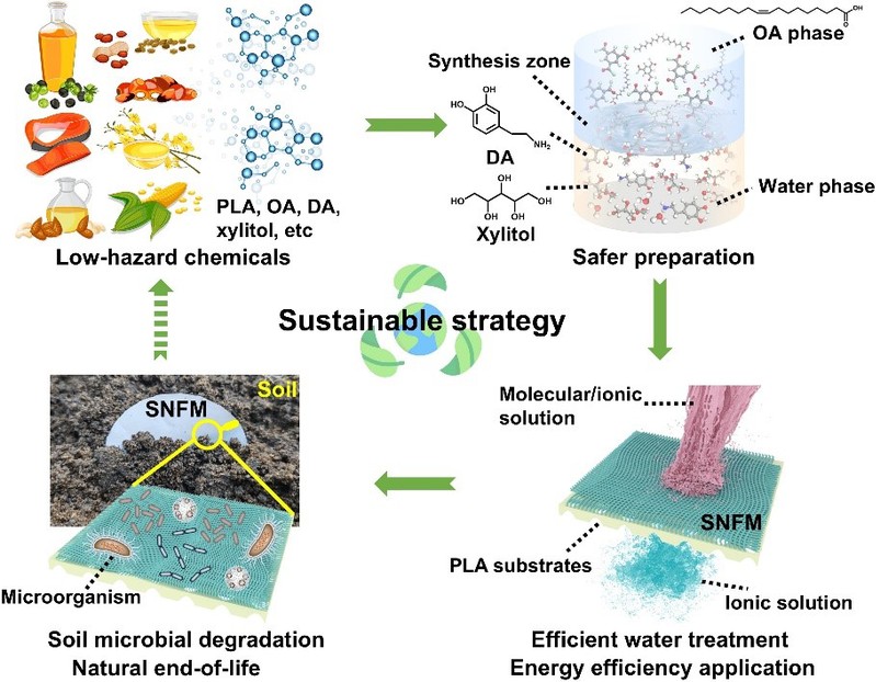 为解决上述瓶颈问题,团队根据绿色化学理念,建立全新绿色可持续纳滤膜体系。绿色可持续纳滤膜以聚乳酸为支撑层,采用木糖醇、多巴胺和油酸等低危害化学品,通过界面聚合法构筑出具有独特波浪状纳米选择性分离层。该方法不仅避免了传统高危溶剂的使用,还使膜具备在自然土壤环境中被微生物降解的能力,实现了全生命周期膜水净化。