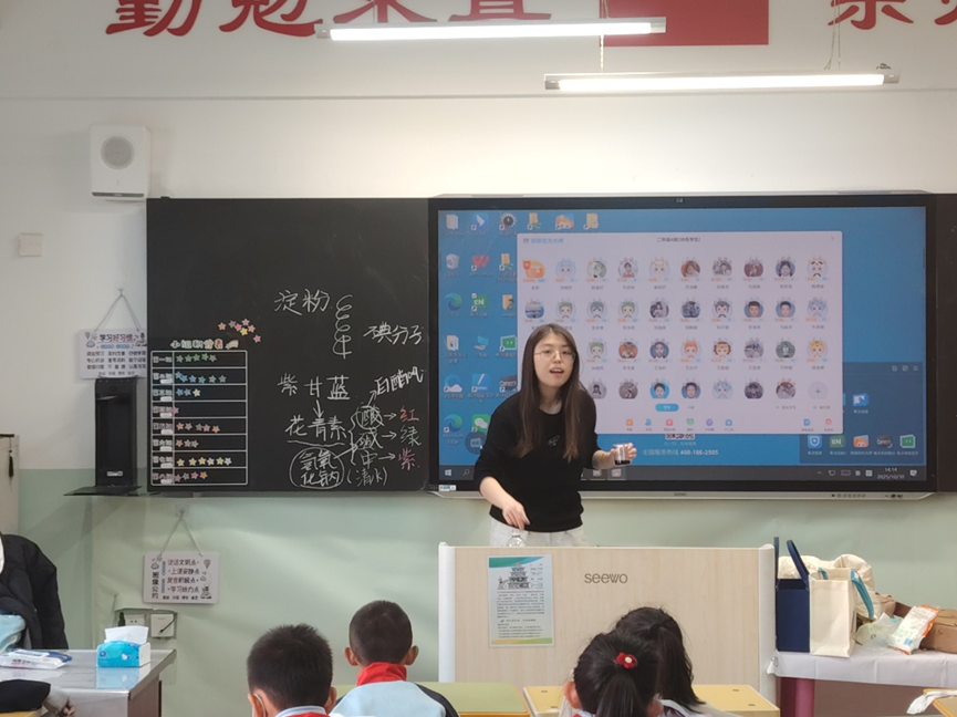 课堂上,志愿者讲师郭瑶围绕“淀粉密写与碘显色反应”和“魔法变色信号灯”两个化学实验,讲解了相关化学原理,并借助实验演示,让抽象的化学知识变得直观可感。在志愿者的指导下,学生动手参与实验操作,用淀粉溶液写下“密信”,喷洒碘液后观察字迹显色;向紫甘蓝提取物溶液中滴入试剂,记录溶液颜色由紫变红、再由紫变绿的过程。