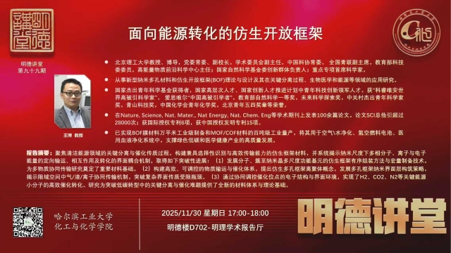 王博,北京理工大学教授、博导,党委常委、副校长,学术委员会副主任。中国科协常委, 全国青联副主席,教育部科技委委员。高能量物质前沿科学中心主任;国家自然科学基金委创新群体负责人;重点专项首席科学家。从事新型纳米多孔材料和仿生开放框架(BOF)理论与设计及其在关键分离过程、生物医学和能源等领域的应用研究。国家杰出青年科学基金获得者,入选国家“****”领军人才、国家创新人才推进计划中青年科技创新领军人才。获“科睿唯安世界高被引科学家”, 爱思唯尔“中国高被引学者”,教育部自然科学一等奖,未来科学探索奖,中关村杰出青年科学家奖,青山科技奖,中国化学会青年化学奖,北京青年五四奖章等荣誉。在Nature, Science, Nat. Mater., Nat Energy, Nat. Chem. Eng等学术期刊上发表100余篇论文,论文SCI总他引超过28000次;获国际授权专利6项,获中国授权发明专利15项。已实现BOF膜材料万平米工业级制备和MOF/COF材料的百吨级工业量产,将其用于空气\水净化、氢空燃料电池、医用血液净化系统中,支撑绿色低碳和医学健康产业的高质量发展。