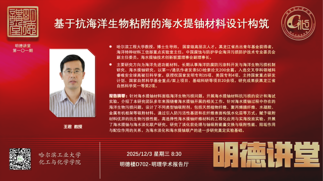 应姚忠平研究员邀请,哈尔滨工程大学材料科学与化学工程学院国家级人才王君教授对我校进行学术访问,并开展060net永利“明德讲堂”学术报告,欢迎广大师生参加。