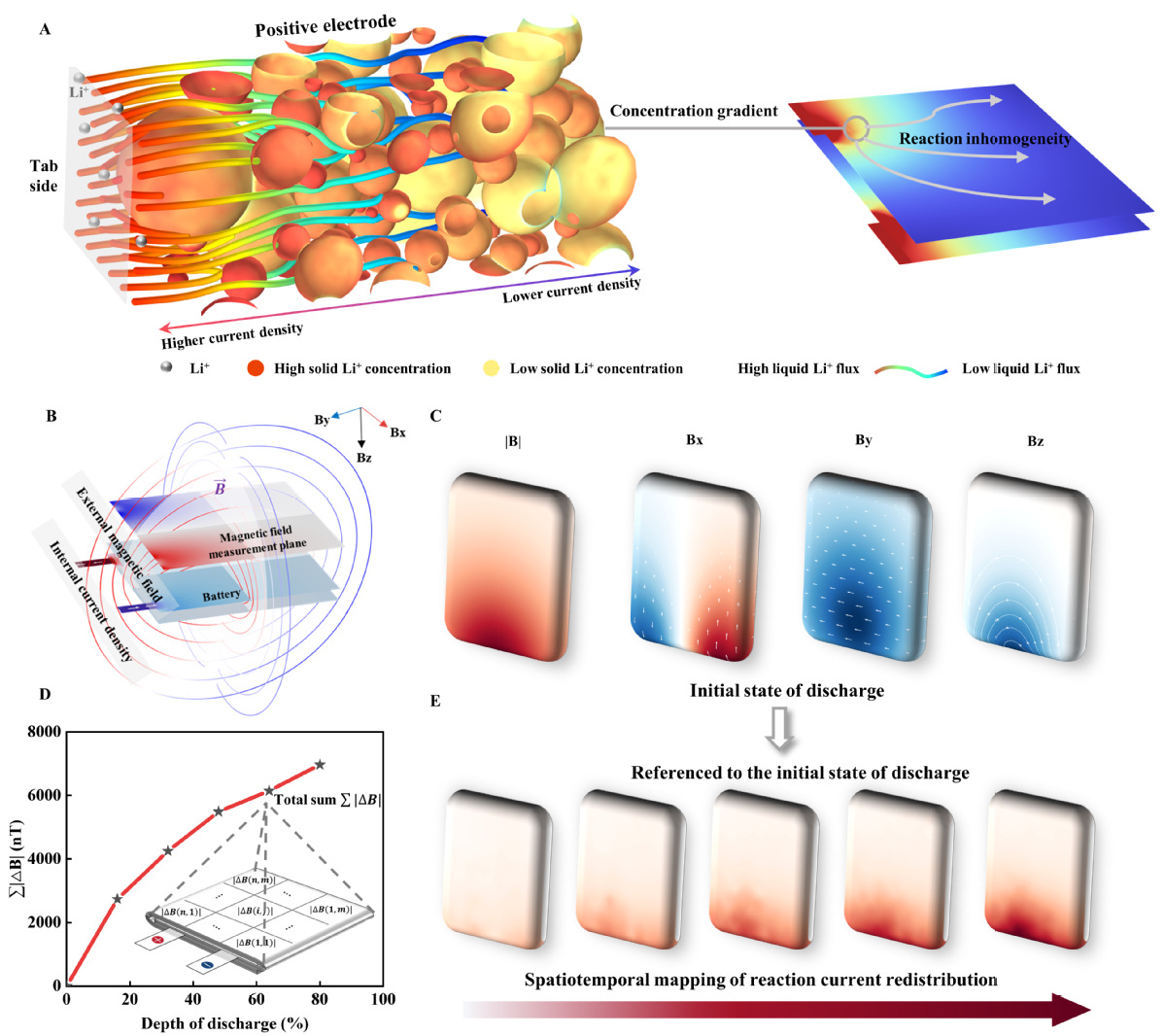 电池内部反应的时空分布及演化是决定电池性能的关键因素,同时也是电池内部状态的重要标志。然而,电池领域长期存在着电池工作过程“内部反应不可见、动态演化难解析”的世界性挑战。团队针对这一挑战,提出电池外部磁场与内部电流密度的定量映射关系,发明了电池内部反应时空动态演变的磁场成像解析新技术,并自主设计构建了高灵敏、低噪声、自动化的原位测试系统,解决了锂离子电池内部反应分布难以准确跟踪的难题。团队运用此技术揭示了锂离子电池运行过程中的内部自调节动态反馈机制。