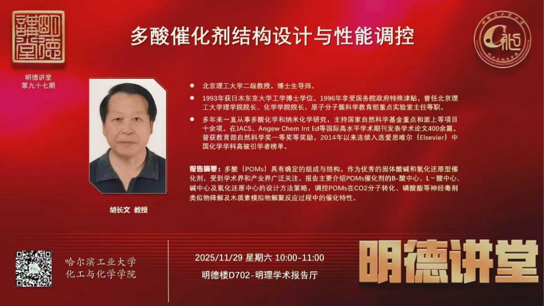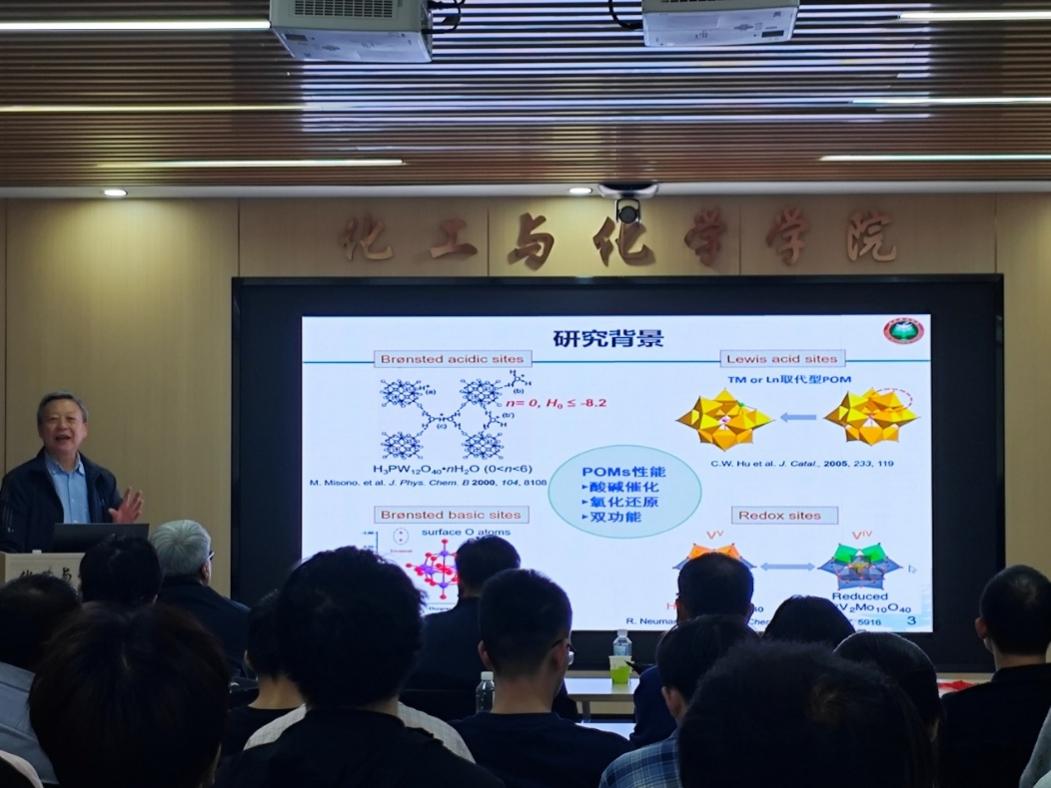 11月29日上午,060net永利“明德讲堂”第九十七期在明理学术报告厅成功举办。北京理工大学教授胡长文应我院应用化学系教授杨玉林邀请,作题为“多酸催化剂结构设计与性能调控”的学术报告。此次报告由杨玉林主持,现场近60位师生参与,积极交流互动。