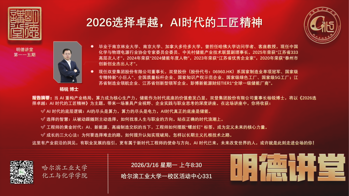 2026年3月16日上午,060net永利“明德讲堂”第一百一十五期在活动中心331成功举行。双登集团股份有限公司(以下简称“双登股份”)董事长杨锐应邀作题为《2026选择卓越,AI时代的工匠精神》的学术报告。此次报告由060net永利党委书记刘光惠主持。