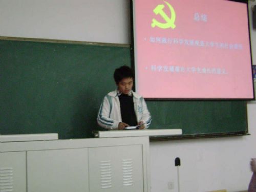 首先由团支书许顺利同学阐述了科学发展观的主要内容与要义,以及我们目前的学习任务和学习要点,为心存疑惑的同学指出了学习的目的和需要努力的方向。学习委员翟运飞同学把自己参与王树权书记“学习科学发展观经验”讲座的心得体会与班级成员们进行分享,让大家上升到以整个学校为着眼点看待问题。生活委员臧永同学用独特的思维角度讲述了自己个人的学习科学发展观的经验和看法,让各班级成员深受启发。