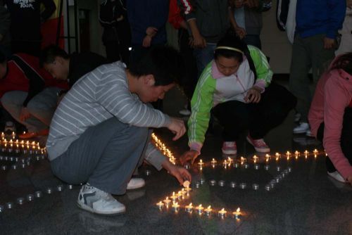 同学们用一枚枚蜡烛串成了一个心连心的图案,寄托对遇难者的哀悼之情,祈祷灾区人民幸福平安。现场的同学们纷纷加入到点燃蜡烛的行动中,为遇难同胞点上一盏“长明灯”,祈祷逝者安息,遥寄哀思,声援汶川,让温暖蔓延,让爱心传递。路过的同学都不约而同地参与到活动中来,为逝者默哀,为生者祈福,为灾区人民重建家园送去美好的祝愿。
