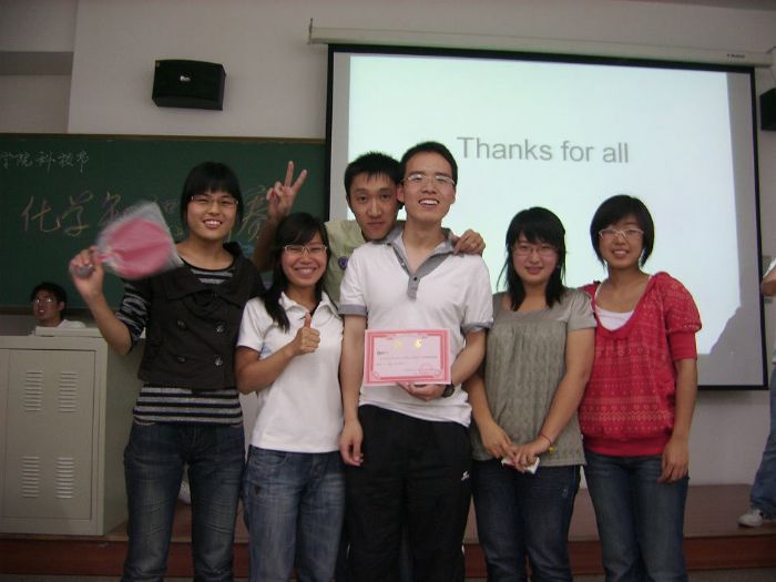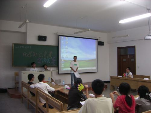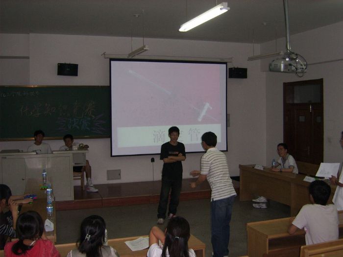 2009年6月7日晚,化工学院科技节之化学知识竞赛决赛在正心213室举行。从近两百人参赛的初赛中脱颖而出的六位优秀的同学参加了此次决赛,他们分别是来自电气学院的袁仲洲,机电学院的罗晓健,熊均、陈星星,以及化工学院的薛刚、王攀攀等。