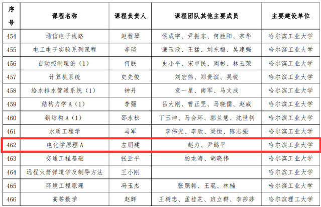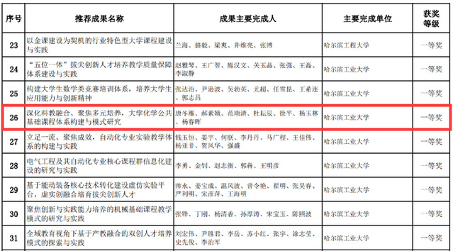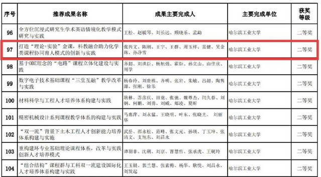 左朋建负责的《电化学原理》获首批国家级线下一流课程;唐冬雁牵头的“深化科教融合、聚焦多元培养,大学化学公共基础课程体系构建与模式研究”获黑龙江省教学成果一等奖;张兴文牵头的“打造‘理论+实验’金课,科教融合助力化学类课程协同育人模式的创新与实践”获黑龙江省教学成果二等奖。