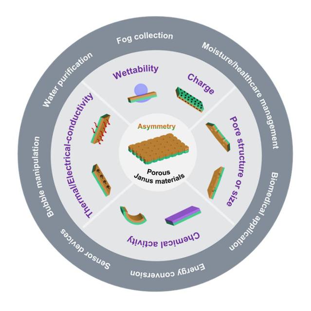 面向环境、能源、生物医学等领域应用的多孔Janus材料是一个前沿新兴概念,其两面具有不对称性质(包括润湿性、电荷、孔径或结构、热/电导率、化学活性等),这些不对称的性质可以经过不同材料组合或现有合成/修饰技术的精心设计获得,使多孔的Janus材料具备一系列的特殊性能。自然界中的Janus材料,比如荷叶,具有典型的不对称润湿性,它的上表面是超疏水的,下表面是亲水/水下超疏油的,使其在空气中具有自清洁性,在水中具有防油污染的特性。与传统均质材料相比,多孔Janus材料凭借不对称性的协同或独立效应,在诸多领域展现出优越的性能和降低能耗的潜力,还可以为瓶颈问题的解决提供新的思路,引起人们的广泛兴趣。
