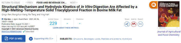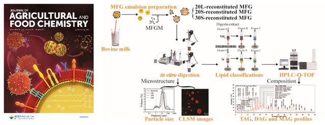 近日,我院马莺教授团队在国际食品顶级期刊(Journal of Agricultural and Food Chemistry,影响因子5.279)连续发表了2篇题为“Structural Mechanism and Hydrolysis Kinetics of In Vitro Digestion Are Affected by a High-Melting-Temperature Solid Triacylglycerol Fraction in Bovine Milk Fat”和“Triacylglycerol Composition of Butterfat Fractions Determines Its Gastrointestinal Fate and Postprandial Effects: Lipidomic Analysis of Tri-, Di-, and Mono-acylglycerols and Free Fatty Acids”的封面文章,马莺教授为文章通讯作者,团队博士生任青兮为第一作者,060net永利为第一通讯单位。